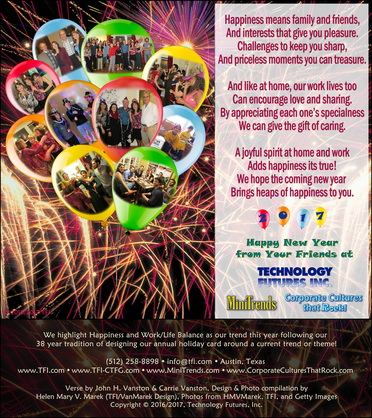 Our 38 year tradition of designing our own TFI holiday card around a trend continues with this year's being about Happiness and Work/Life Balance!