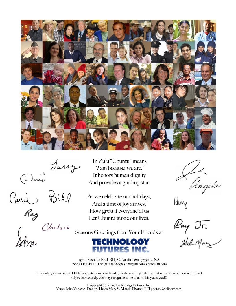 Since 1978, we at Technology Futures have created our own holiday cards, selecting a theme that reflects a recent event or trend. We hope you enjoy this year's card and wish you Happy Holidays!